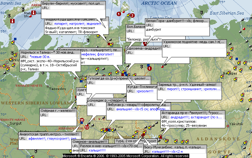 Местонахождения минералов Средней Сибири и прилегающих территорий с примерами находок. Составил: © А.А. Евсеев. Внимание: название и привязка (положение на карте) некоторых местонахождений требует уточнения (показаны на карте красными и коричневыми значками). Карты предназначены только для образовательных целей. Подробнее: Евсеев А.А. Атлас мира для минералога. М., 2004. - 284 с.