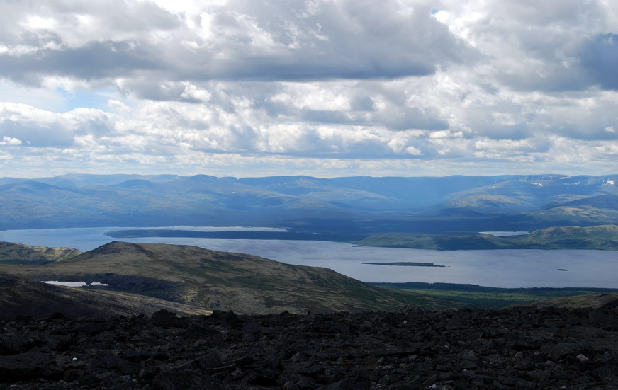 Вид на Хибины и Умбозеро с плато г. Аллуайв (Ловозеро, Кольский п-ов). 2000 г. Фото: © В.Г. Гришин.